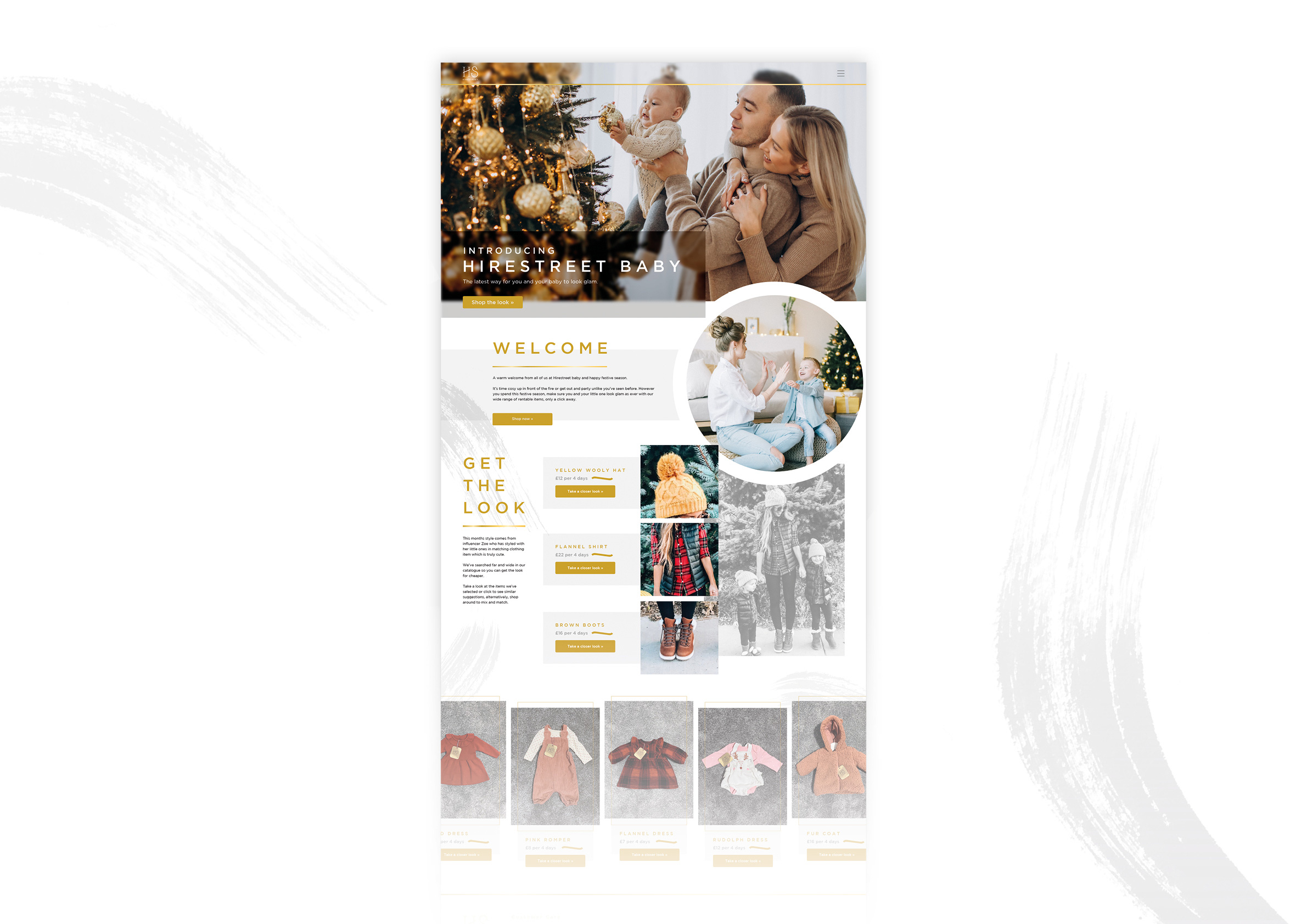 For my project, I created a new logo for them and wanted to focus on the Hirestreet baby approach, something they have not delved into. The idea behind this is babies grow so quickly so purchasing a Christmas clothing item for them before Christmas can be a hassle, especially new born as how do you know they will fit in it when the time comes. Parents in this case can purchase items from Hirestreet to rent and return soon after.